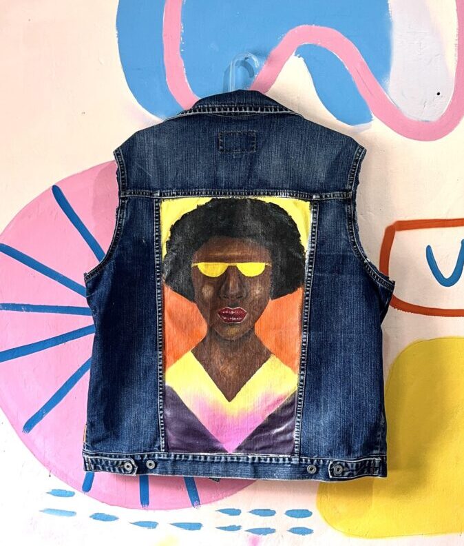 Colete jeans personalizado pelo artista visual Gamba Martins. Peça única. Pintura feira com spray e tinta de tecido sobre jeans.