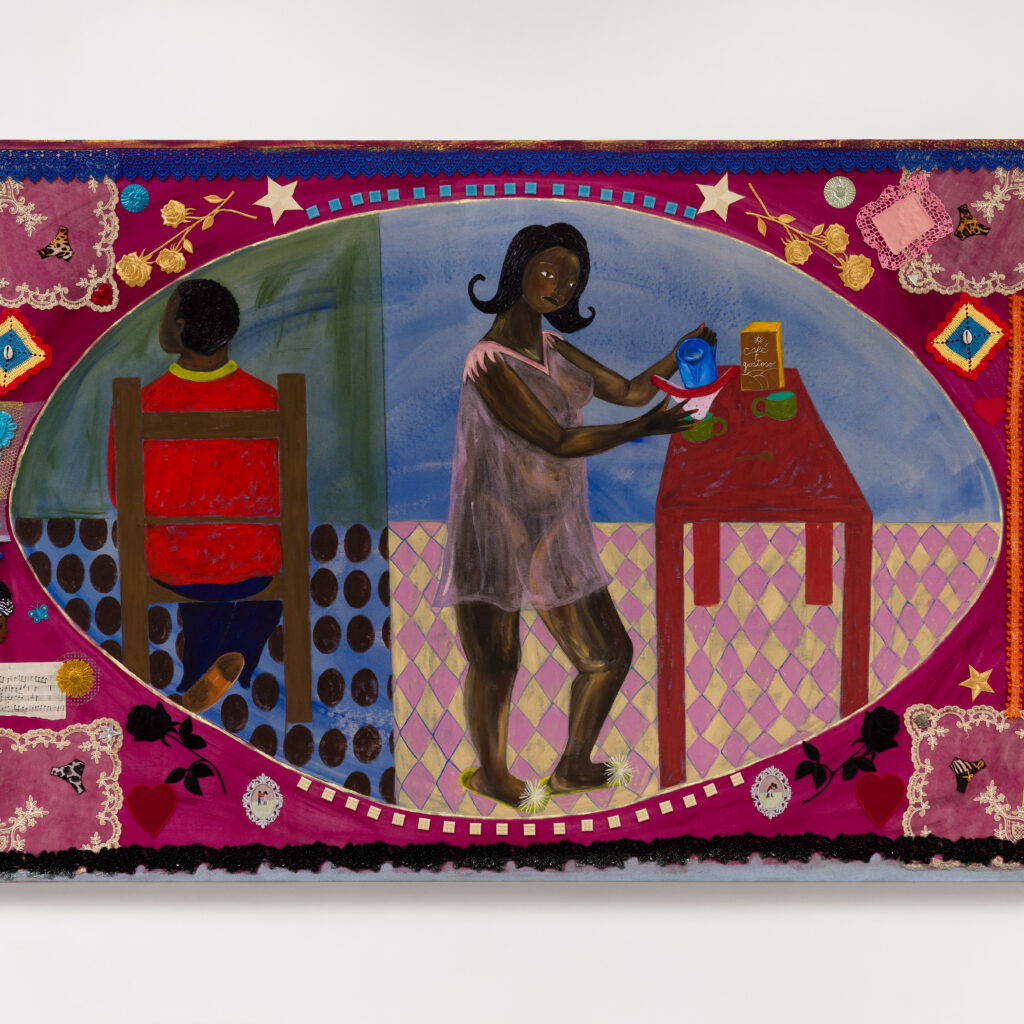 Larissa de Souza (São Paulo, 1995) é artista autodidata. Em sua pintura, majoritariamente figurativa, concentra-se na imagem da mulher afro diaspórica – seu universo particular e coletivo –, navegando entre a memória, o corpo, o desejo e a ancestralidade. Souza retrata cenas afetivas que destacam a importância da experiência negra em seu testamento poético, questionando o silenciamento da população negra pelo pensamento colonial e escutando a ancestralidade inscrita no corpo. Sua pintura carrega a história das mulheres de sua linhagem e a força de muitas outras. Por meio de um universo cromático muito singular, marcado por texturas e também aplicações como bordados, ladrilhos e tecidos que integram sua composição, Larissa possui trabalhos nos acervos do Museu de Arte do Rio – MAR, no Rio de Janeiro, e Museu de Arte de São Paulo Assis Chateaubriand – MASP, em São Paulo.
